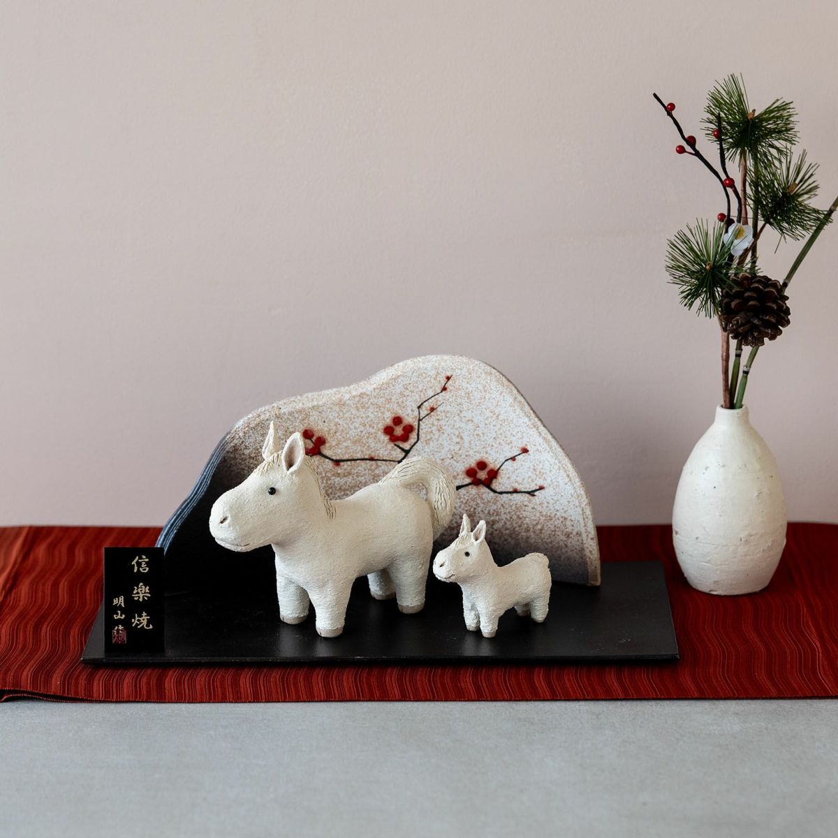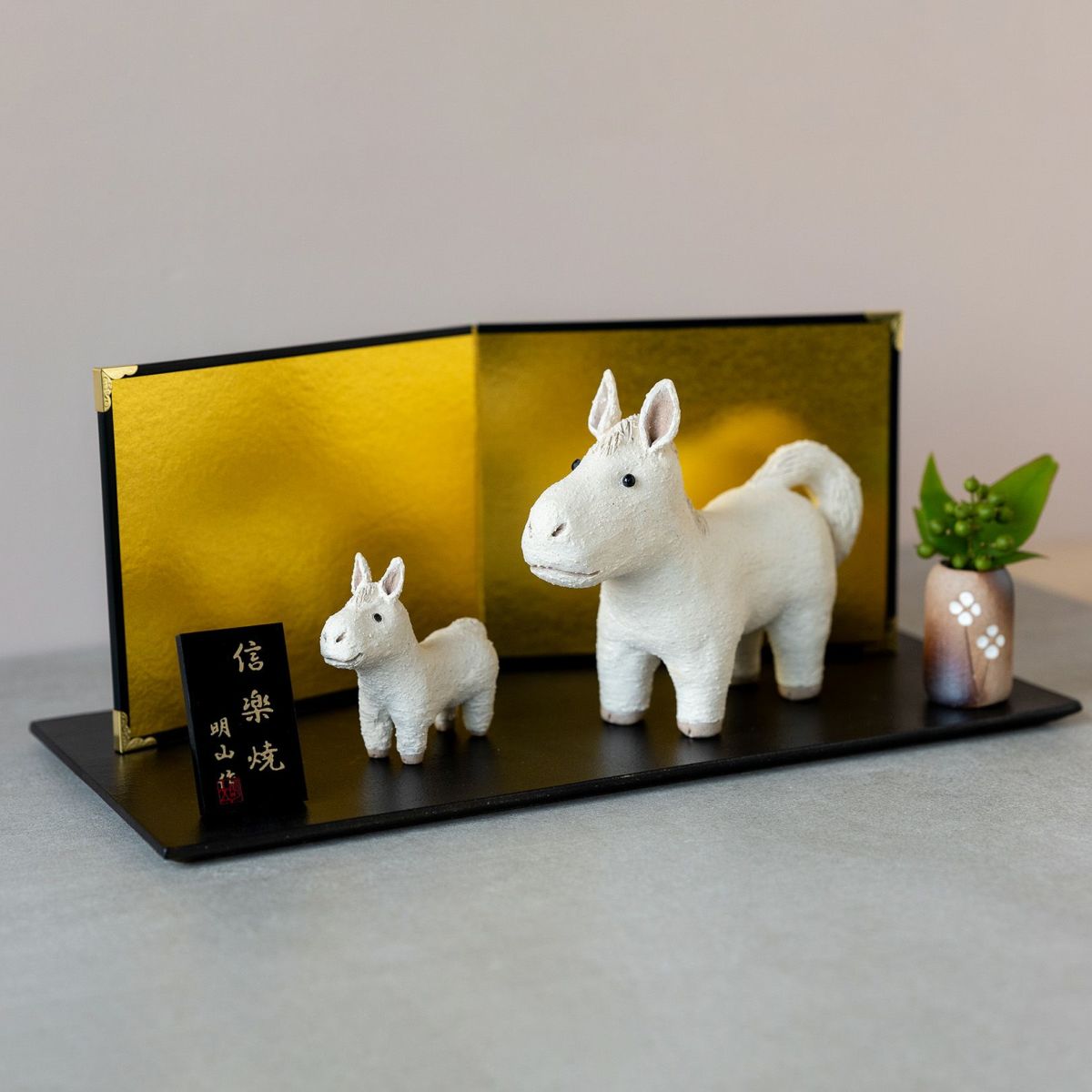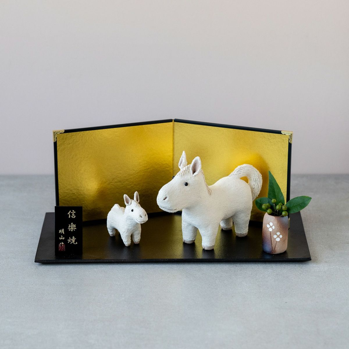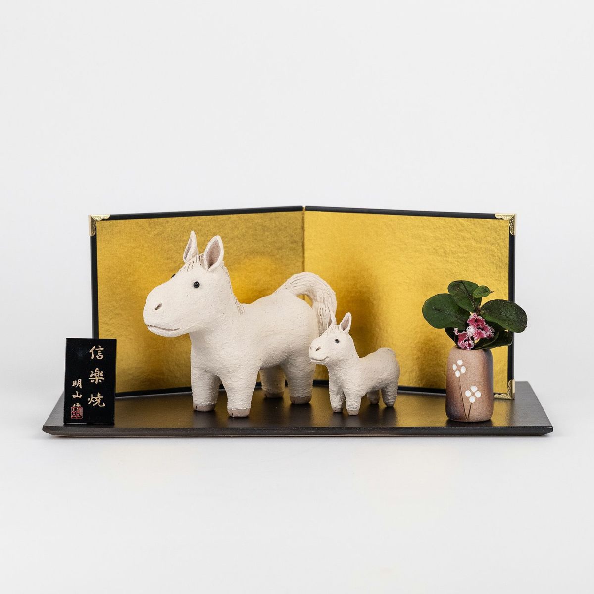 サイズ | セット全体サイズ:w360×d165×h140(mm) 親うま:w55×d170×h130、仔うま(大):w30×d85×h75(mm) 陶板:h10×w360×d163、金屏風(大):h135×w330(mm)2曲サイズ 立札:h60×w35×d20 |