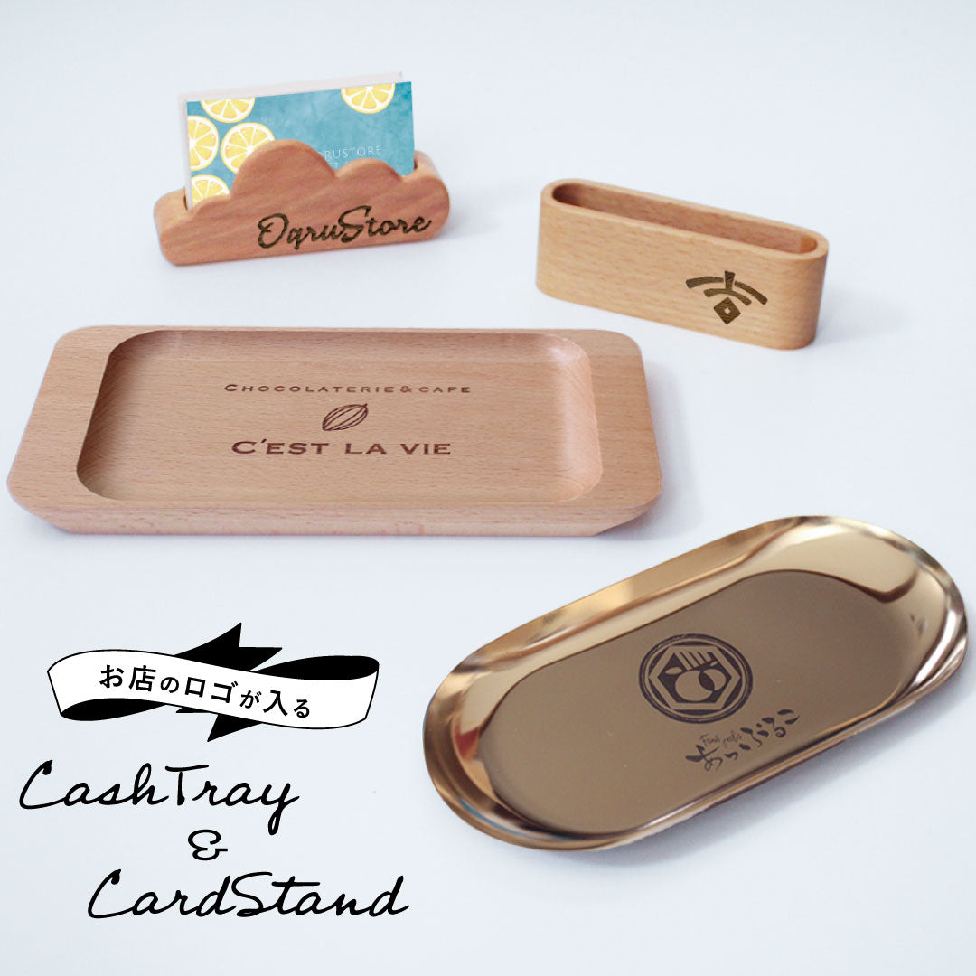 友達やお世話になっている方が独立したときに贈る、開店祝い。胡蝶蘭やお花や最近ではバルーンなど開店の日を彩るプレゼントはたくさんありますが、どれもそこそこのお値段になるので逆に気を使わせてしまうんじゃないかと、開店祝いを躊躇することがありますよね。 こちらの「お店のロゴが入るシリーズ」はレジカウンターに置いてずっと使えるので実用的。 お店のロゴには、店主のこだわりや想いが込められています。ロゴはただのシンボルではなく、お店の理念や商品に対する情熱を視覚的に表現されたものなので、ロゴに対する店主さんの思いは並々ならぬものなので、きっと喜ばれると思いますよ✨ ステンレス キャッシュトレイ 光沢のあるステンレスのトレイはレジカンターのアクセントになります。また、ネイルやエステのサロンではお客様のアクセサリー置きなどにもお使いいただいています。 木製キャッシュトレイ ステンレスより少し大きいサイズの木製キャッシュトレイ。ナチュラルな感じのカフェやヘアサロンによく合います。 カード立て(雲型、楕円型) ショップカードは小さなお店を経営する方にとっては重要アイテム。ロゴの入った可愛いカード立てに立てておくと、手に取りやすく、お客様が簡単に持ち帰ることができます。 このロゴで作成出来るかなというお問い合わせはよくありますし、悩むことも多いとおもいますので、お気軽にチャット・LINEください。出来るだけ早くお答えします。