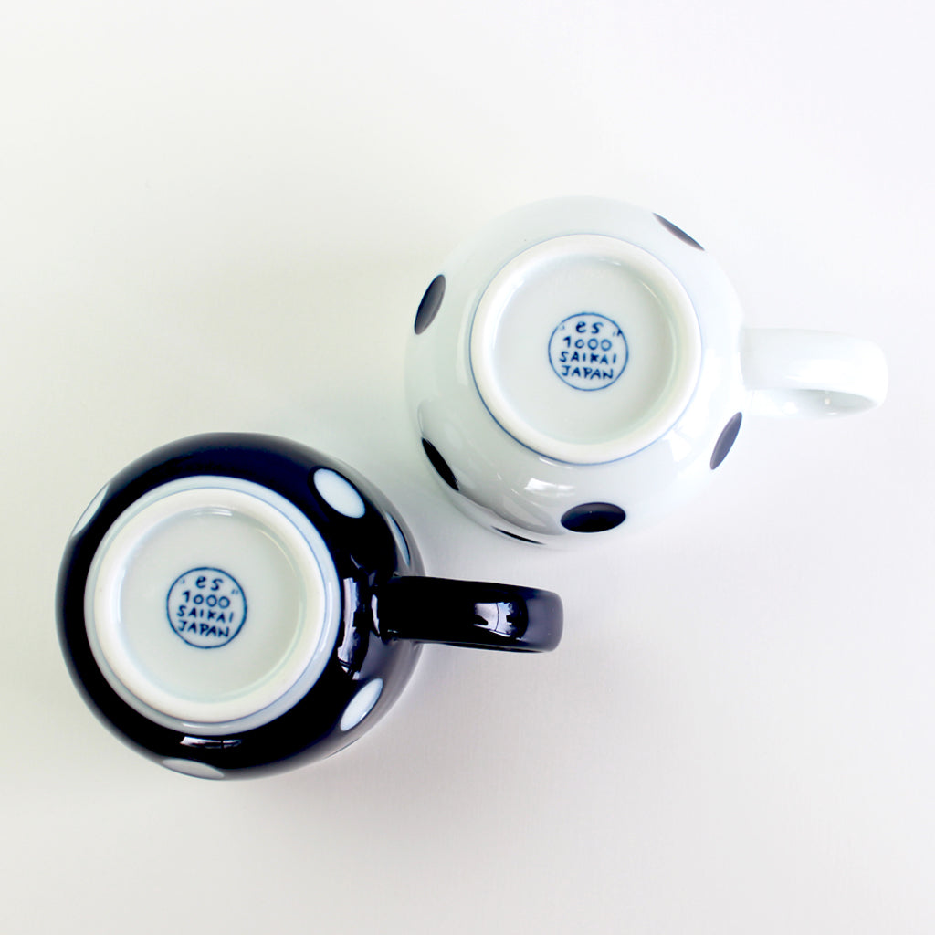 長崎県波佐見町の磁器食器のメーカー、西海陶器よりessence of lifeのネガポジのマグカップです。青色がnega(ネガ)、白色がpoji(ポジ)、容量は270mとたっぷり入ります。